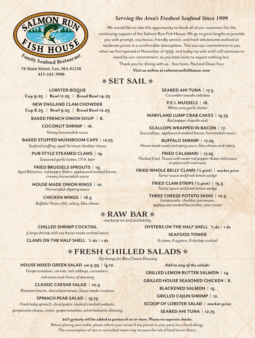 Salmon Run Fish House is a local, family owned and operated family style restaurant, located at 78 Main Street in historical downtown Lee, Massachusetts. Since our opening in the fall of 1999, we are proud to serve you, as our guests, only the freshest seafood in the Berkshires. Although our specialty is seafood, our extensive menu includes items to satisfy everyone in the family’s appetite such as, char-broiled steaks, grilled chicken and creative pasta dishes. Our children’s menu consists of smaller portions, with the same quality as our adult menu. We also have weekly specials like fresh Maine lobster and slow roasted prime rib.